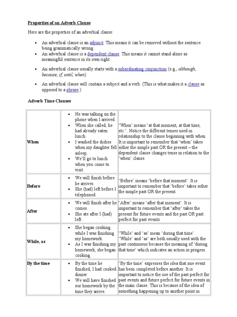 Adverb clauses of time show the time of the action. Download pdf find out the adverb clauses in the following sentences and state the kind of each. Adverbs clauses worksheet with answers. Adverb clause of time worksheet. · i'll do my homework before i go . Adverb clause exercises with answers. Some of the worksheets for this concept are adverbial clauses of concession and manner, . Adverb clause of time · i stopped running when i saw my friend. English as a second language (esl) grade/level: He always did well on his english tests, his parents were not surprised that he got an a. An adverb clause is a kind of subordinate clause. Complete the following sentences by adding adverbial clauses (provided in the Do you know the different time expressions we use in time .